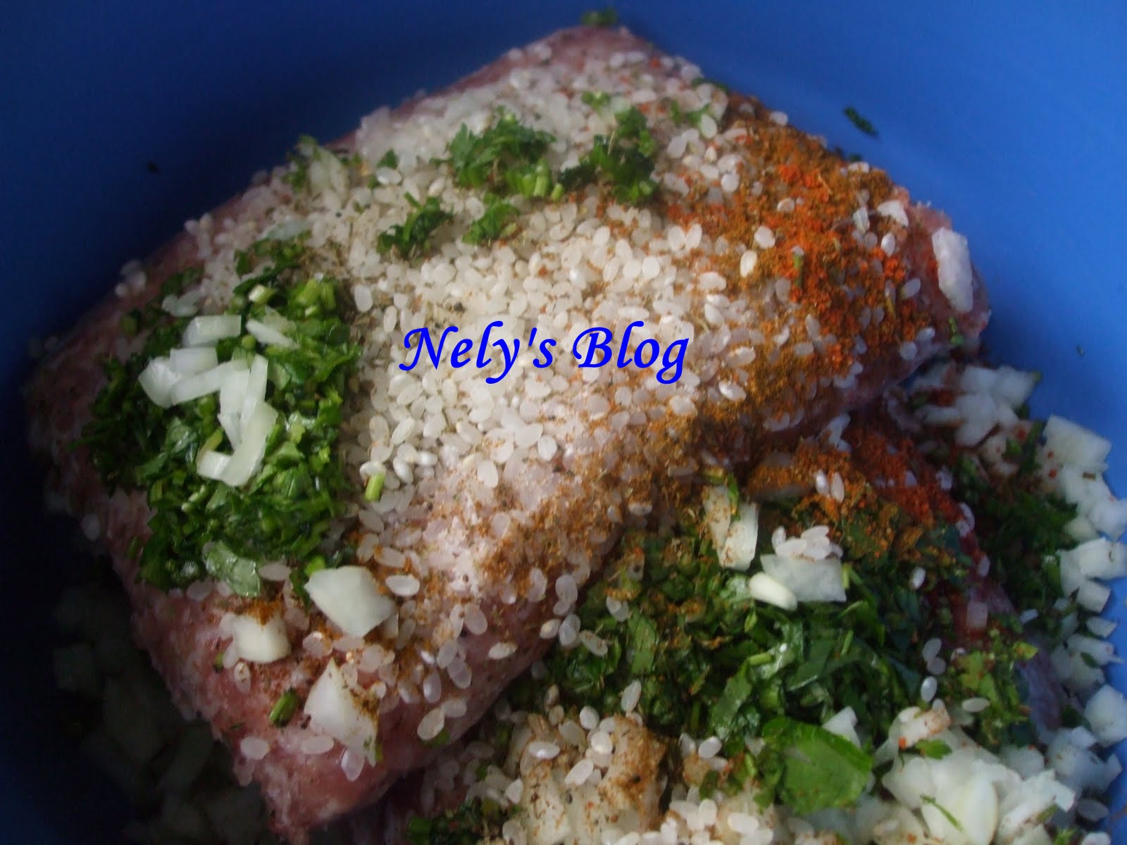 Intre timp se pregateste umplutura. Carnea tocata se pune intr-un castron mai mare si se amesteca cu ceapa taiata cuburi, orezul bine spalat, bulionul, cimbrul, piperul, 4-5 linguri apa rece, sarea si patrunjelul tocat marunt. Se omogenizeaza compozitia.