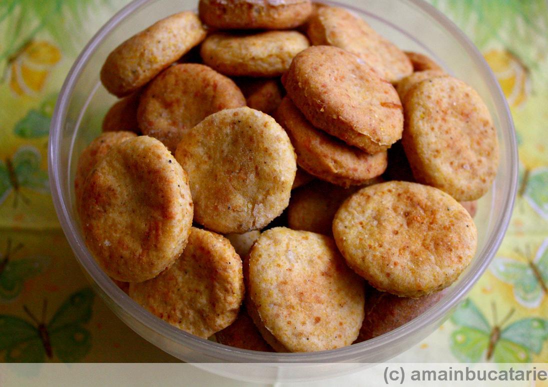In weekend am pregatit ceva de rontait sa am ceva pregatit cand ma apuca pofta de junk food. Acesti biscuiti sunt absolut pe sufletul meu de rontaitor in fata televizorului :)) Si Dan a confirmat ca merg perfect si cu un pahar de vin rosu, eu nu am de unde sa stiu, sunt consemnata doar la apa plata.