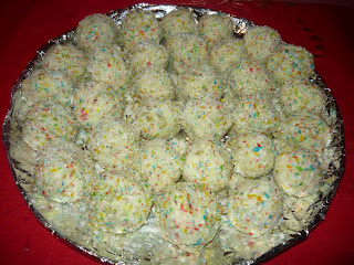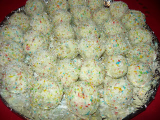 - daţi bomboanele astfel formate prin nucă de cocos (eu am avut multicoloră) şi aşezaţi-le pe un platou;