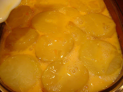 Dupa cele 30 minute, scoatem tava din cuptor, batem ouale si turnam peste cartofi.