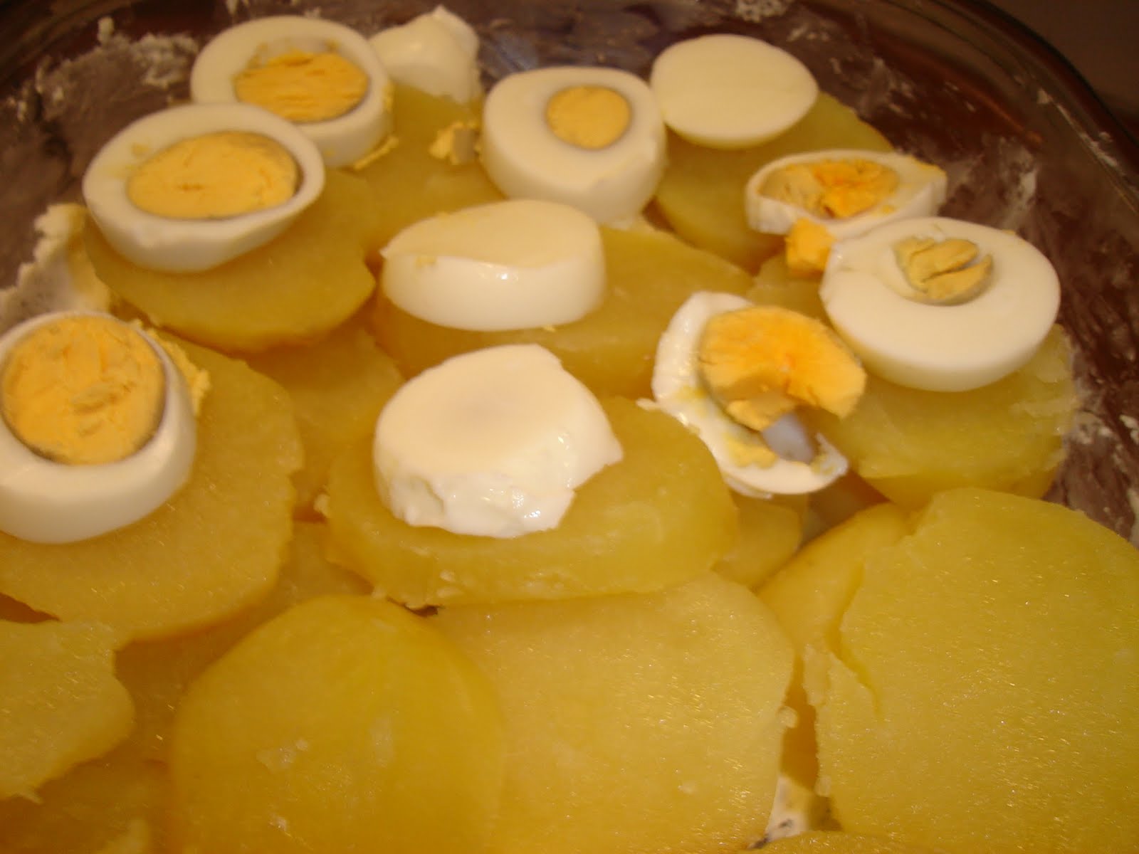 Dupa ce cartofi au fiert, se curata de coaja si se taie rondele. La fel procedam si cu ouale.