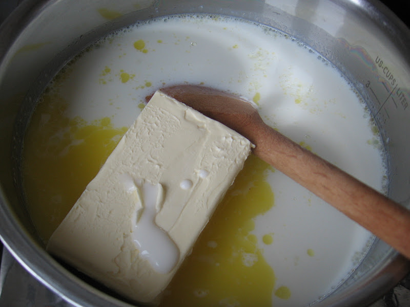 1. Laptele se pune la fiert, înpreună cu untul şi zahărul. Când a dat în clocot , se ia de pe foc şi se lasă să se răcească.