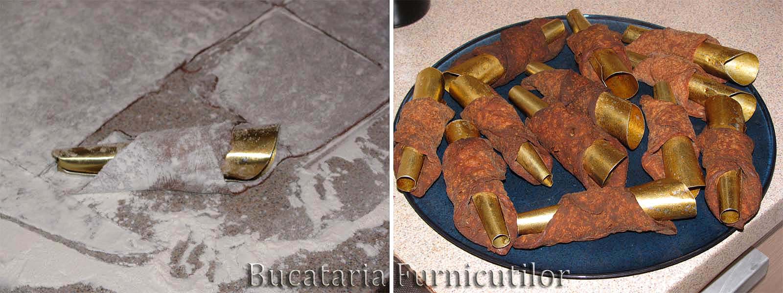 Inca o reteta din insorita Sicilie, un desert cu destul de multe calorii, dar foarte bun. Singurul defect este ca pe cannoli le-am prajit in ulei, in rest toate ingredientele sunt ok. Dar ce sa-i faci, daca asa e traditia italienilor :) Cannoli sunt un aluat rulat pe un tub, de aici venind si denumirea, singularul cannolo insemnand tub mic. Sunt esentiale formele de metal, aceleasi ca pentru rulouri, pe care le vom praji cannoli. Noroc ca mama furnicutului e o bucatareasa specialista in deserturi si gasim la ea tot felul de ustensile, asa si am avut de unde imprumuta formele :)