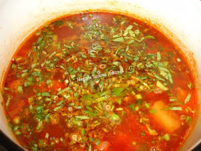 6. Se presara jumatate din verdeata tocata, se drege de sare si se pune pasta de tomate dizolvata in putina zeama.