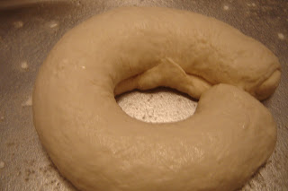 Se pune ruloul intr-o tava ,unsa si tapetata cu faina,se unesc cele doua capete ale ruloului,sa se obtina un cerc.