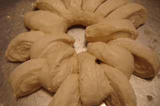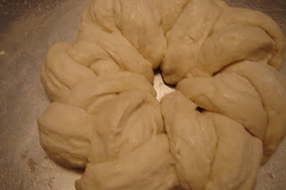 In mijlocul colacului,se pune un rulou micut,impletit in doua.Se lasa iarasi la crescut.