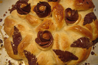 Cand colacul a prins crusta(rumenit foarte putin)l-am scos din cuptor si am lipit decorul cu miere diluata cu un pic de lapte.Nu am pus decorul de la inceput,pentru ca,atunci cand incepe aluatul sa creasca,decorul se "ingroapa".