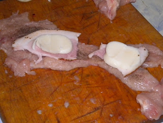 Am folosit 2 bucati de piept de pui, sunca afumata, cascaval, condimente, ulei.