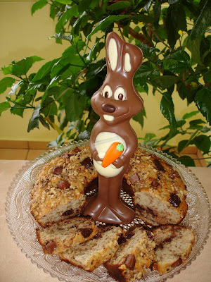 Bananele pasate si ouale mixate cu zaharul si coaja de portocale se amesteca impreuna cu untul tinut la temperatura camerei. Stafidele se hidrateaza in cognac si rom iar ciocolata se taie bucati mici si se baga la congelator. Se adauga la compozitie faina amestecata cu praful de copt, stafidele hidratate si se pun trei sferturi din cantitatea de nuca si jumatate din cea de ciocolata. Dupa ce am omogenizat turnam compozitia intr-o forma de guguluf unsa cu grasime si tapetata cu putina faina. Presaram deasupra restul de nuci si ciocolata si dam la cuptorul incins pentru 30-40 de minute. Introduci o scobitoare si daca iese curata inseamna ca este gata.