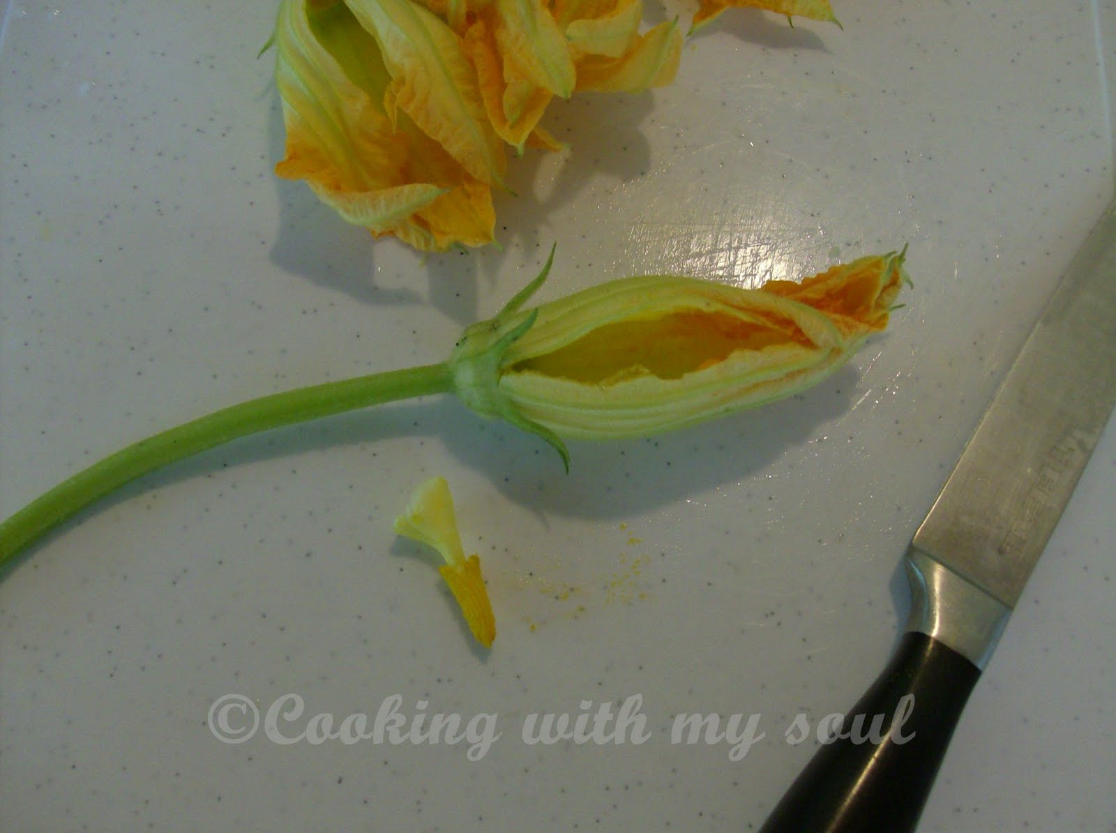 Dovlecelul are doua tipuri de flori. Cele din care se formeaza leguma (care de fapt e un fruct) sunt florile femeiesti, iar cele care cresc pe o tulpinita sunt cele barbatesti. Ambele tipuri de flori sunt comestibile si pot fi folosite in tot felul de mancaruri si garnituri. Eu am folosit din cele barbatesti pentru ca mi s-au parut mai usor de manevrat.