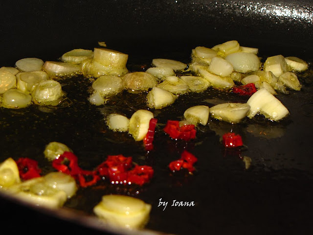 Intr-o tigaie am pus la incins uleiul( cam 2 linguri) si am adaugat usturoiul taiat rondelute
