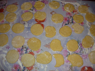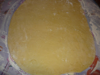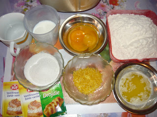 Eu, bineînţeles, am obţinut aluatul în urma eforturilor maşinii de facut paine (aşadar nu am niciunmerit aici!). Am pus ingredientele - aşa cum prevede reţeta - în cuvă în ordinea următoare: apa calduţă, laptele călduţ, untul topit în prealabil în cuptorul cu microunde (atenţie! untul nu trebuie sa fie fierbinte!), gălbenuşurile, zahărul tos, pliculeţele de zahăr vanilinat, coaja rasă de la o lămâie, pliculeţul de drojdie uscată, făina şi sarea. Am lasat la frământat şi dospit aproximativ 1 ora şi 30 minute. Daca aluatul nu creşte în acest timp, puteţi să îl mai lăsaţi la crescut, la loc cald, câteva zeci de minute.După ce scoatem aluatul, îl întindem pe o planşetă acoperită cu făină, într-o foaie de aproximativ 1 cm grosime.