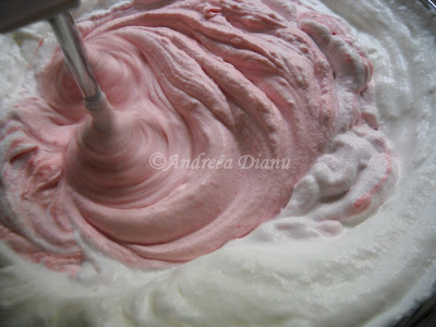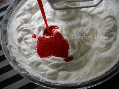 Capsunile se pun intr-un blender si se fac piure,o sa devina mai degraba un sos delicios. Sosul se toarna peste amestecul de frisca,lapte si iaurt si se omogenizeaza.