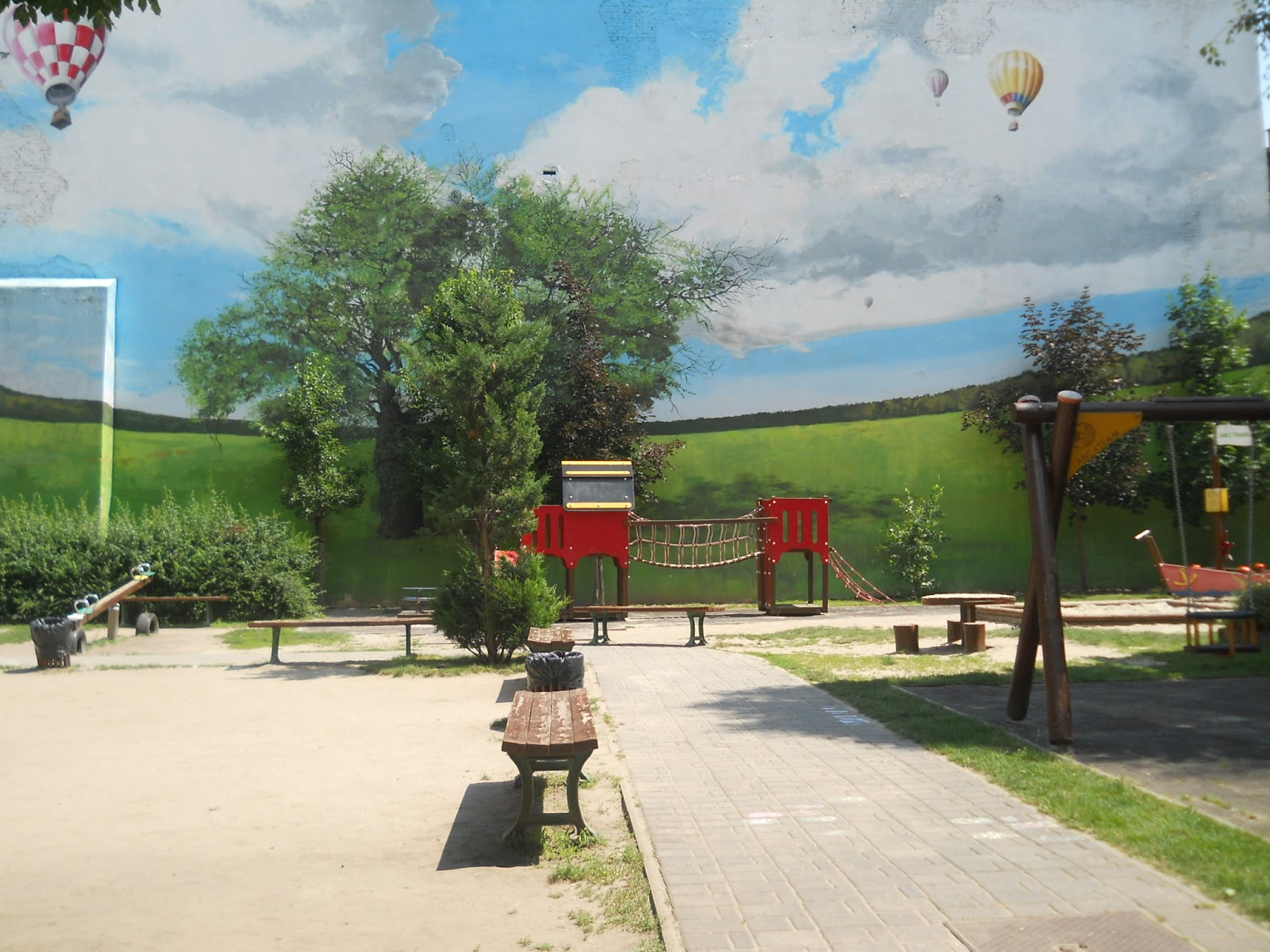 Am trecut pe langa un frumos parc pentru copii, realizat pe locul unei cladiri vechi, iar tot zidul celeilalte cladiri a fost vopsit foarte frumos, cu baloane de aer, creand un spatiu special.