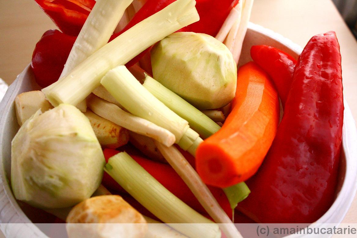 Acum o fac din necesitate si atunci cand fac piata cumpar cantitati de la un kilogram in sus. Nu exista o reteta - cumpar cam orice gasesc pe piata si stiu ca ar merge intr-o ciorba/supa. In cazul de fata am pus morcovi, patrunjel, telina, pastarnac, gulii, praz si ardei.