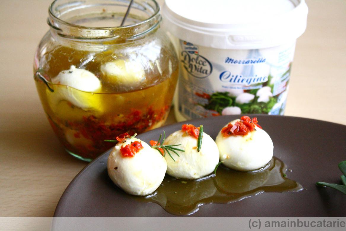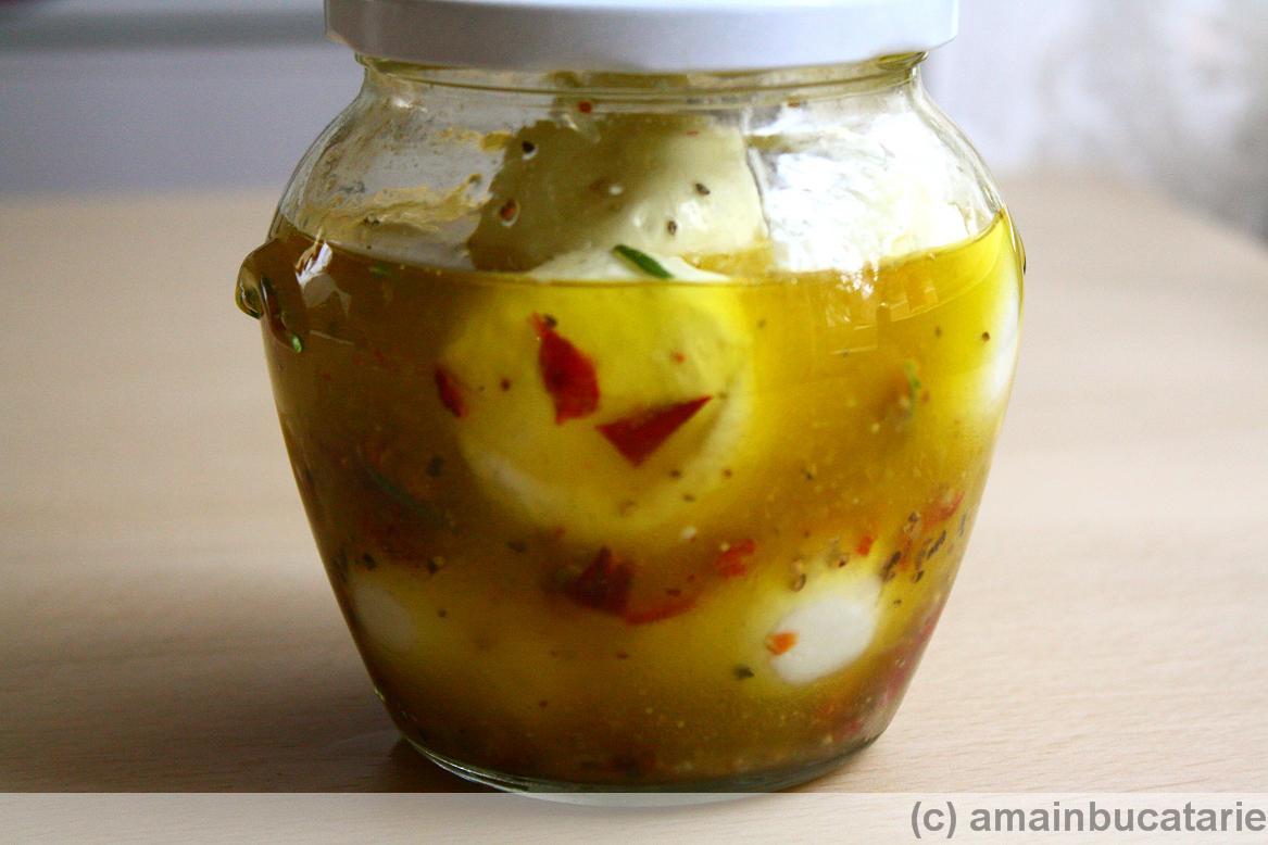 4. Inchideti borcanul si rasturnati-l cu grija sa se amestece cat mai bine uleiul si sa inveleasca toate bucatelele de mozzarella.