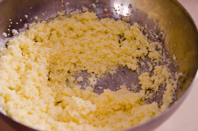 Intr-un alt castron amestecati cu degetele rapid untul rece impreuna cu faina si zaharul pana obtineti o compozitie sfaramicioasa. Presarati deasupra hartiutelor si dati la cuptorul incins pentru 25-30 de minute. Faceti testul cu scobitoarea daca este nevoie.