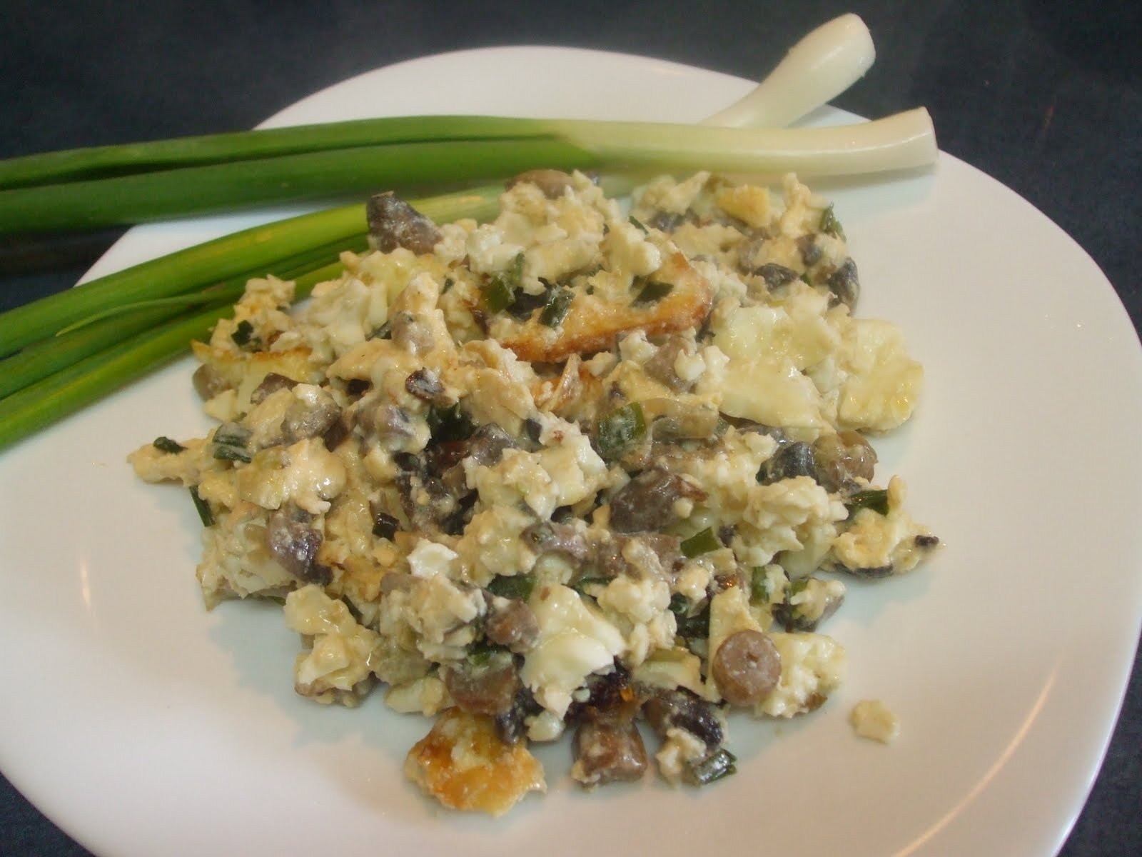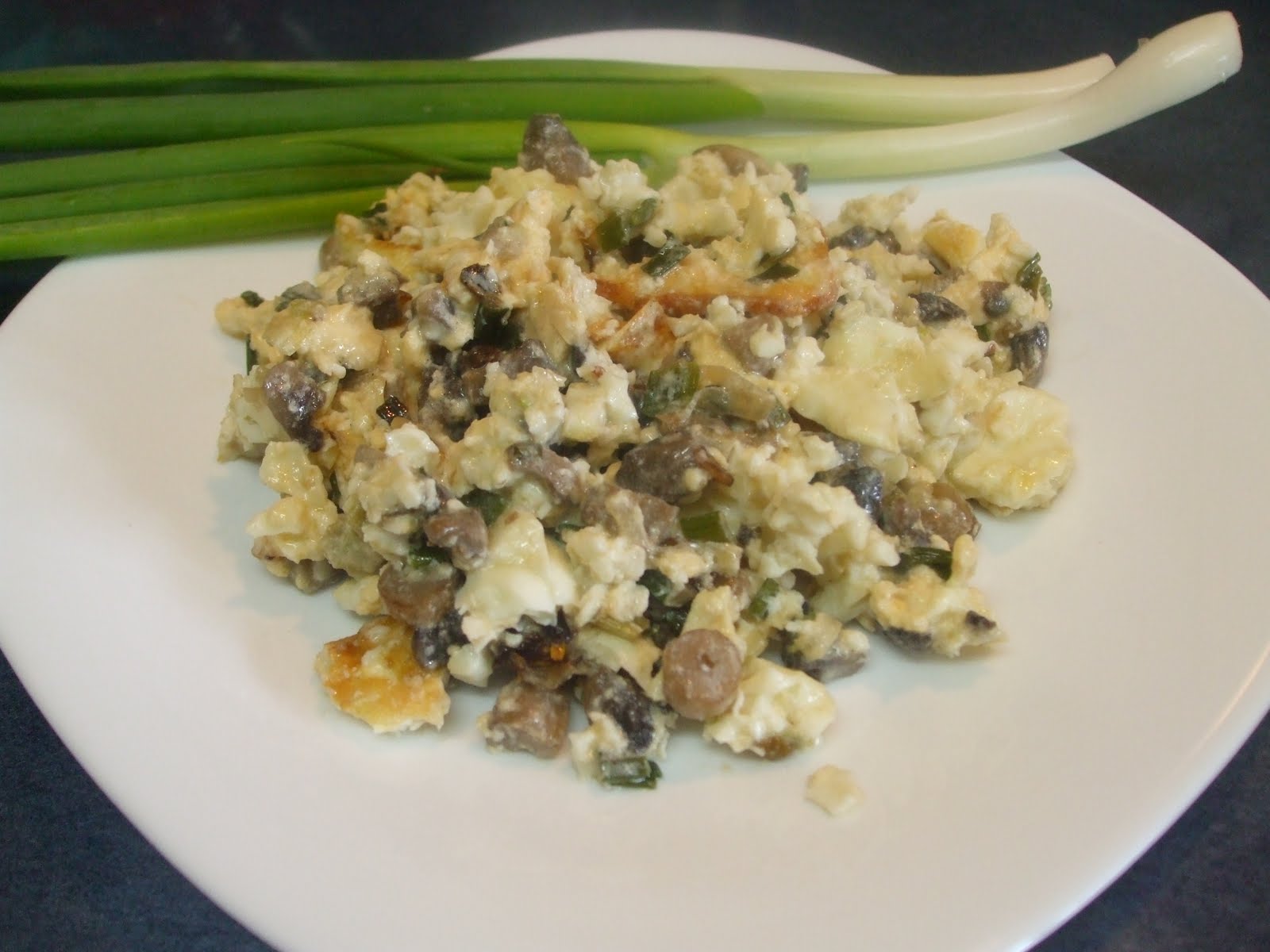 Se curata ciupercile si ceapa, se spala bine apoi se taie felii. Se pun impreuna la calit in putin ulei de masline. Cand sunt gata se scot intr-un castron. Se prepara ouale ochiuri dupa care se scot, se pun peste ceapa si ciuperci si se sfarama cu ajutorul unei furculite.Se adauga smantana si se potriveste de sare.