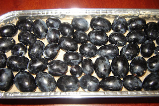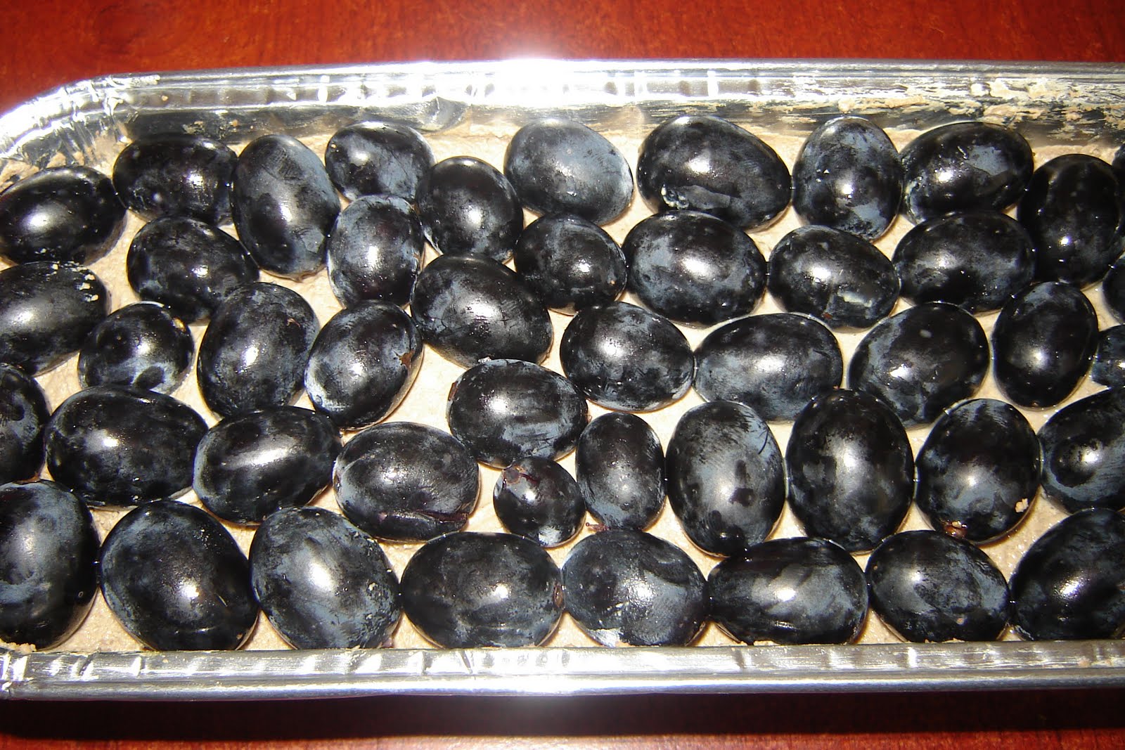 Tot amestecul se pune intr-o tava mai micuta(22/8),se apasa usor,cu dosul unei linguri,se neteeste si deasupra se pun boabele de struguri,spalate si zvantate.