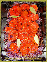 Se feliaza rosiile decojite, dupa ce in prealabil am scurs sucul in care erau conservate, asezindu-le intr-un strat peste ceapa calita, pastrind citeva feliute cu care vom decora pestele. Se aseaza pestele deasupra apoi se orneaza cu felii de rosii, se adauga boabele de piper si frunzele de dafin. Se sareaza dupa gust apoi se toarna sucul de rosii in vas dupa care il introducem la cuptor. Plachia va fi gata cind sosul a scazut complet, iar pestele va fi rumenit.