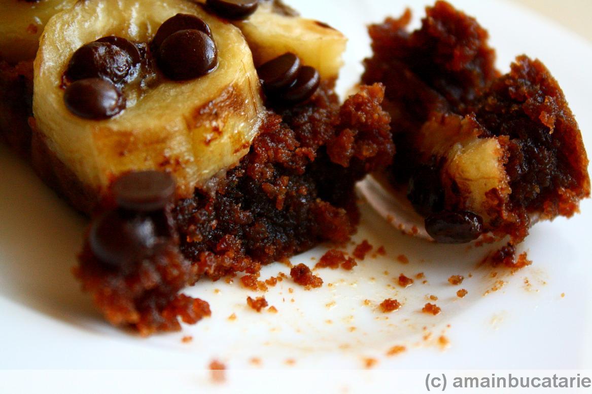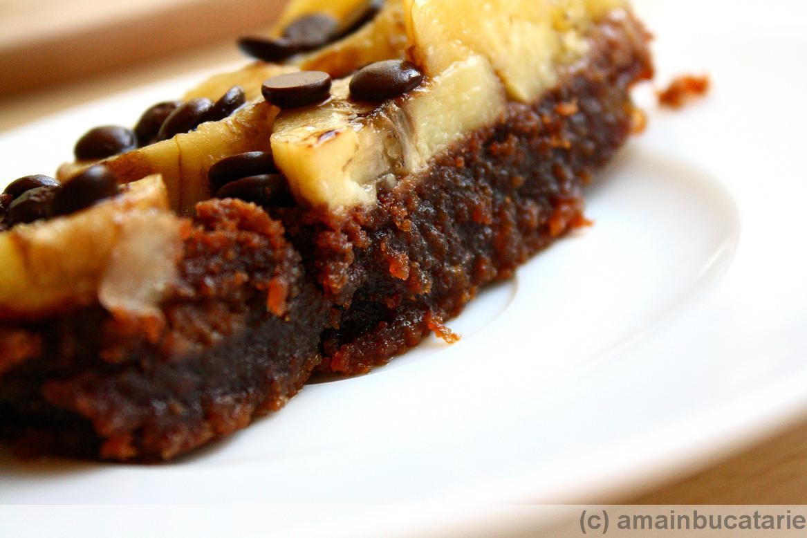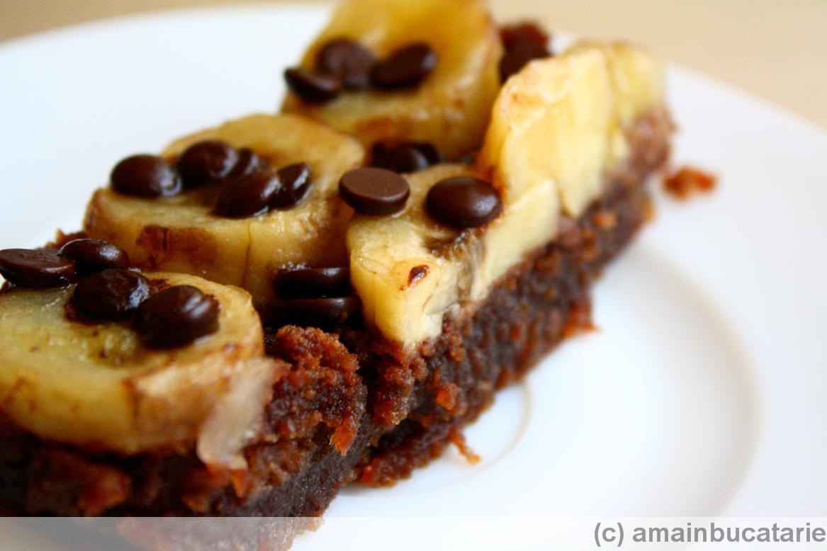 Intre timp taiati feliute bananele. Asezati-le pe aluatul de biscuiti, presarati cu ciocolata si mai dati la cuptor 10-15 minute.