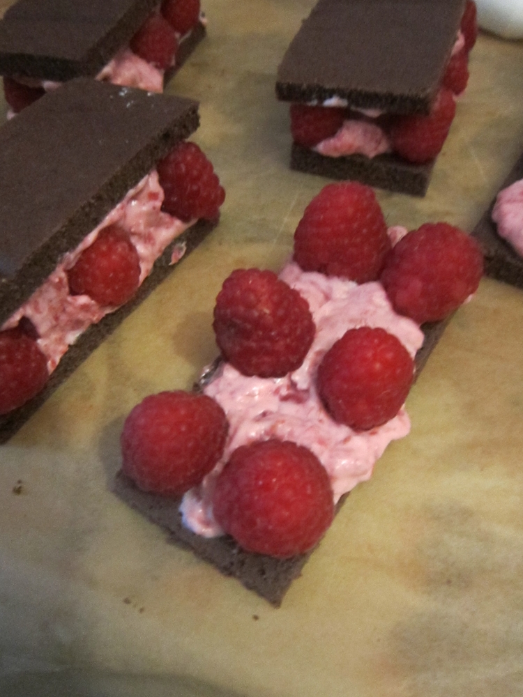 2. Pe 6 dreptunghiuri pune cate 6 bucati de zmeura, apoi pune celelalte dreptunghiuri deasupra.