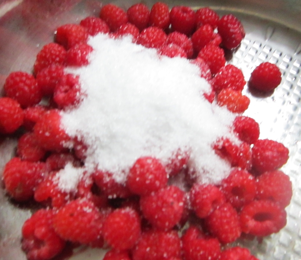 1. Pune zmeura intr-un vas impreuna cu indulcitorul si zeama de lamaie, la foc mic. Lasa pe foc pana cand scade lichidul (~ 8min) si obtii o compozitie groasa. Dupa ce s-a ingrosat lasa sa se raceasca complet (eu grabesc procesul de racire punand vasul cu zmeura intr-un alt vas in care am pus apa rece).