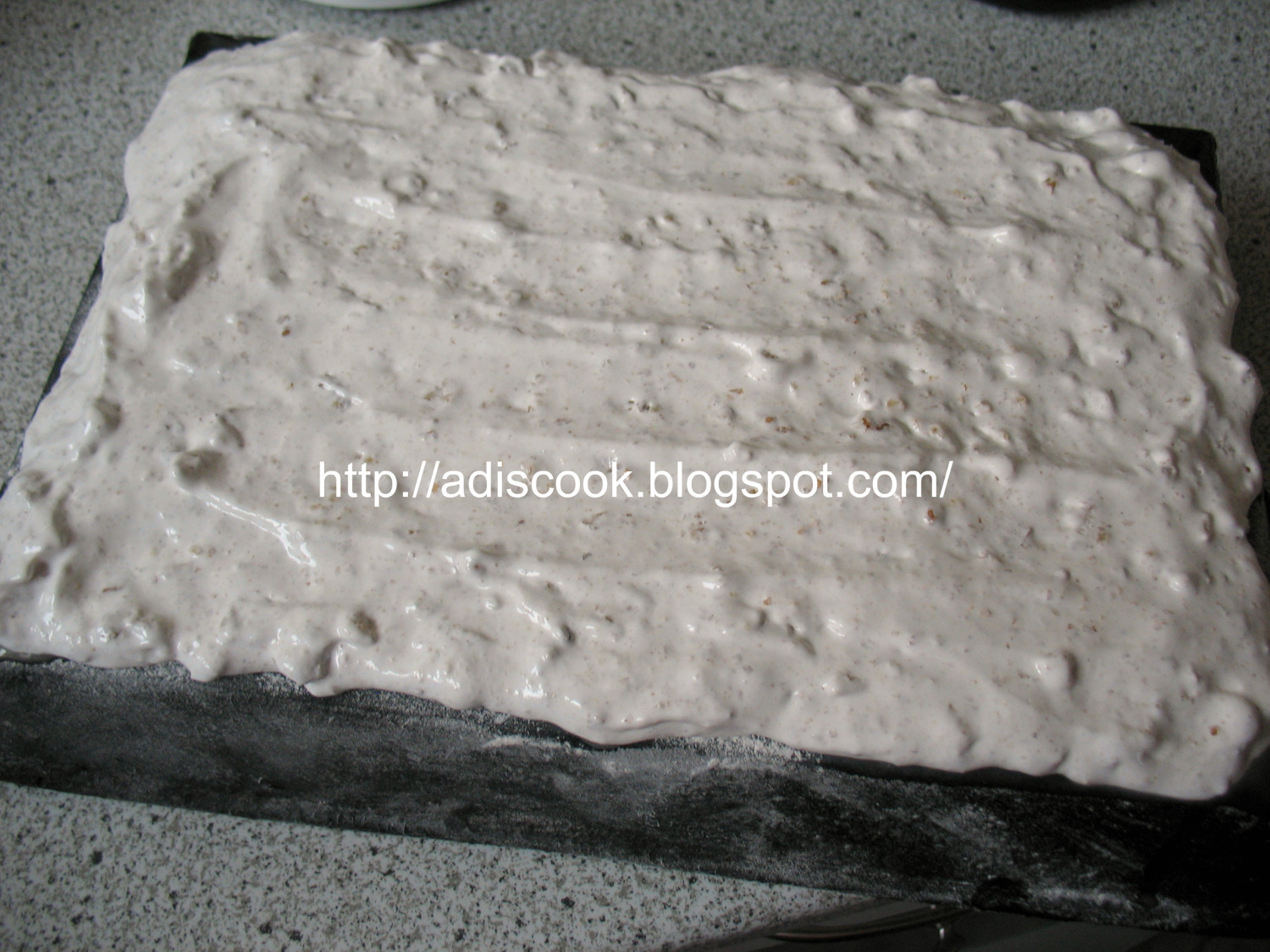 Nucile zdrobite se amestecă cu făina şi se adaugă în bezea, amestecând uşor cu o lingură.