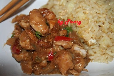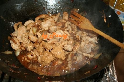 -Dupa care se scoate pe o farfurie si in sosul ramas se calesc ceapa ,ghimbirul,ardeiul rosu si ardeiul iute.