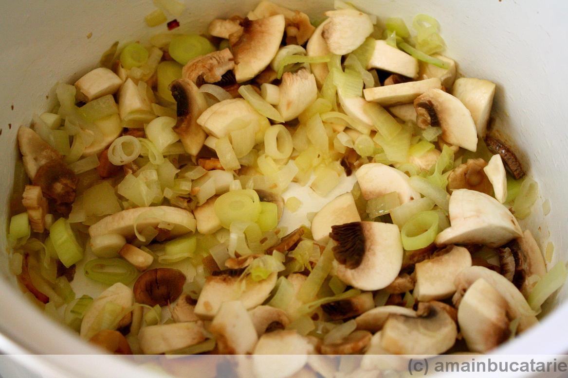 Topiti untul intr-o oala si caliti in el ceapa pana devine aurie. Abia atunci adaugati ciupercile tocate, presarati nucsoara si mai lasati sa se caleasca aproximativ 10 minute.