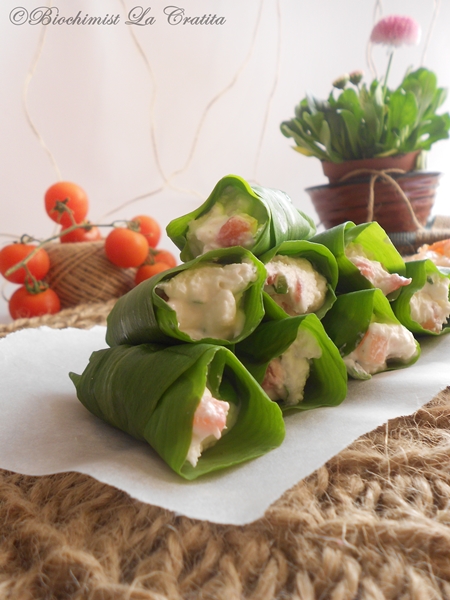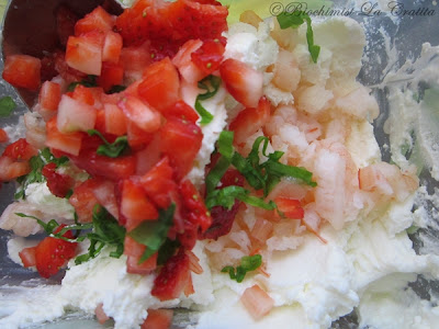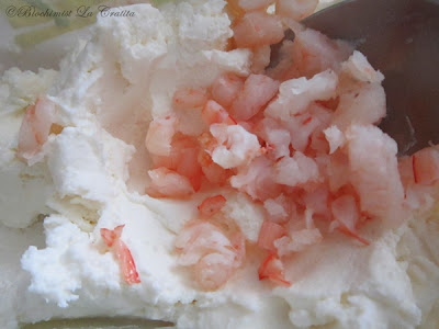 1. Taiem crevetii, capsunele cubulete si 1/2 frunza de leurda fasii subtiri si le amestecam cu branza, iaurtul si praful de sare.