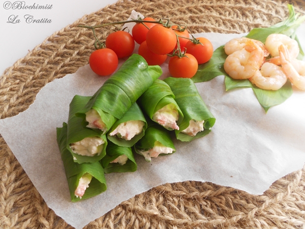 3. Punem apoi cate o lingurita din compozitie pe fiecare frunza si rulam.