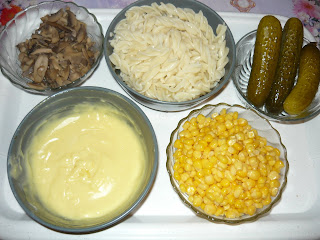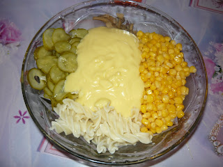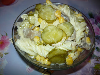 - amestecăm toate ingredientele: porumbul scurs de sucul în care a fost conservat, ciupercile, pastele, castravetele şi maioneza. Asezonăm şi dăm la rece.
