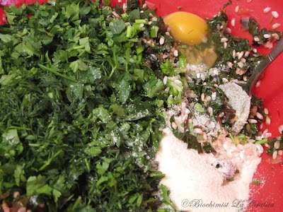 6. Intr-un vas amestecam loboda tocata cu orezul, ceapa calita, oul, grisul, patrunjelul, mararul sarea si piperul.