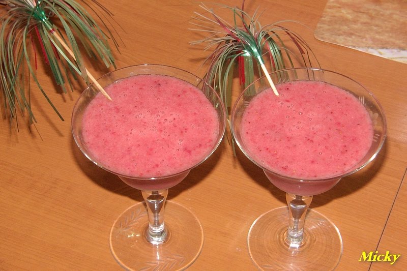 Se pun capsunile spalate si curatate de codite, banana taiata bucatele, apa si gheata pisata in blender.