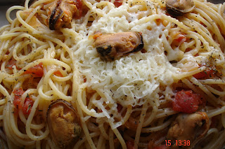 Am calit ceapa si usturoiul in putin ulei de masline.In acest timp apa pentru paste deja clocotea pentru ca pastele le-am tinut cu un minut mai mult decat scria pe ambalaj (7 min) iar carnea de scoici fiind congelata se face foarte repede.Peste ceapa si usturoi am adaugat carnea de scoici care am calit-o cam 2 minute.Peste toate cele mentionate mai sus am adaugat rosiile.Am lasat sa fiarba 10 minute.