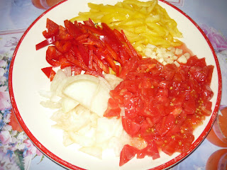 - 3 ardei roşii sau galbeni, curăţaţi de seminţe şi tăiaţi în felii subţiri (eu am avut doi roşii şi unul galben)