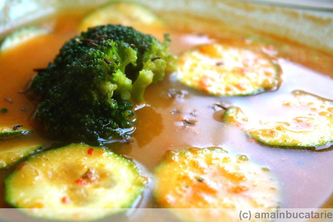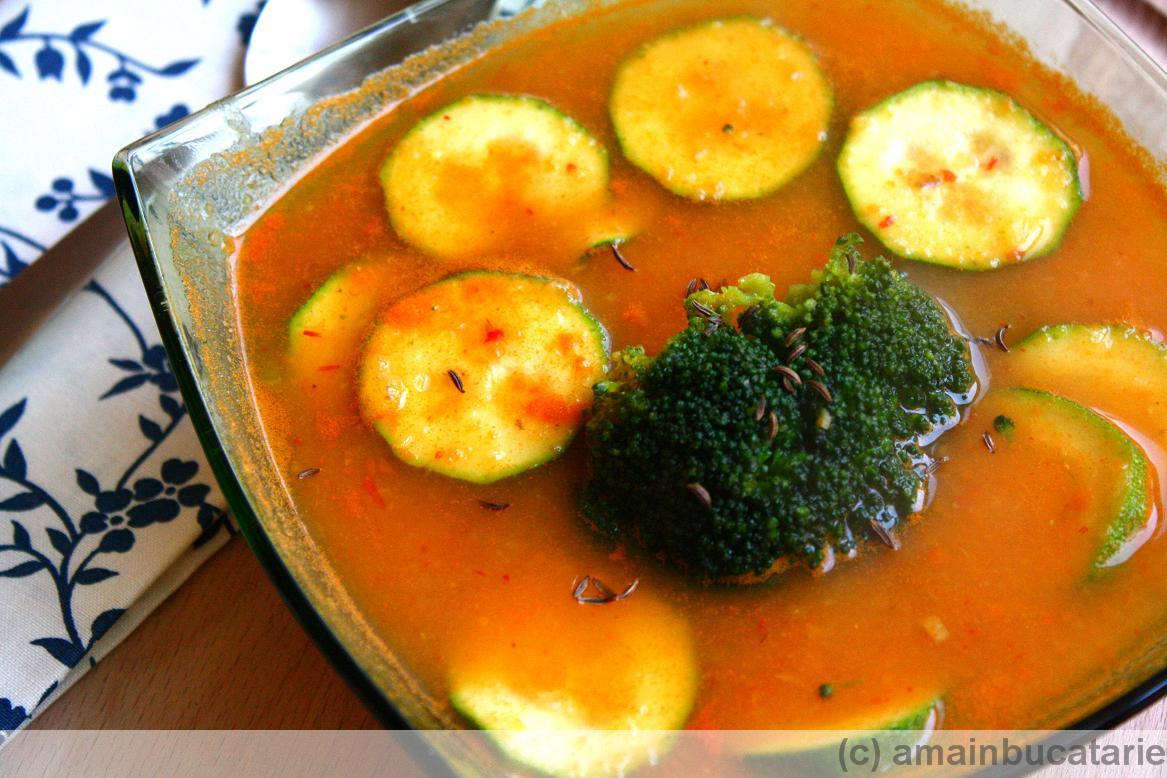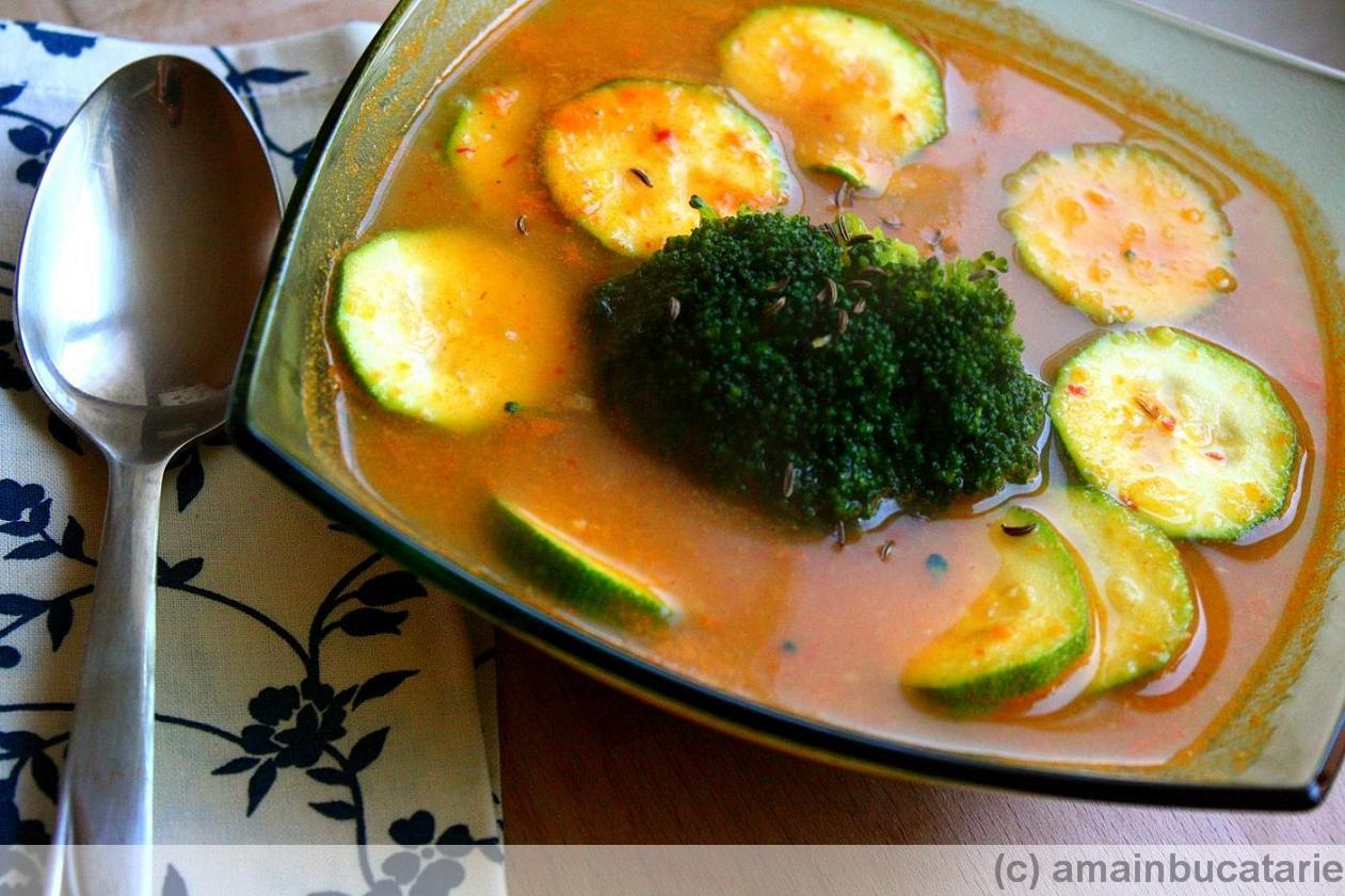 Scoateti din supa cateva feliute de zucchini si cateva buchetele de broccoli si puneti-le deoparte. Restul supei o dati prin robot (eu folosesc un robot de mana care se poate introduce in apa fierbinte, dar daca folositi blenderul lasati supa sa se raceasca putin). Adaugati inapoi legumele scoase si serviti.