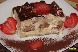 Peste piscoturi aranjam jumatate din capsuni apoi jumatate din crema, iar un strat de piscoturi imbibate cu cafea, capsuni apoi ultimul strat de crema.