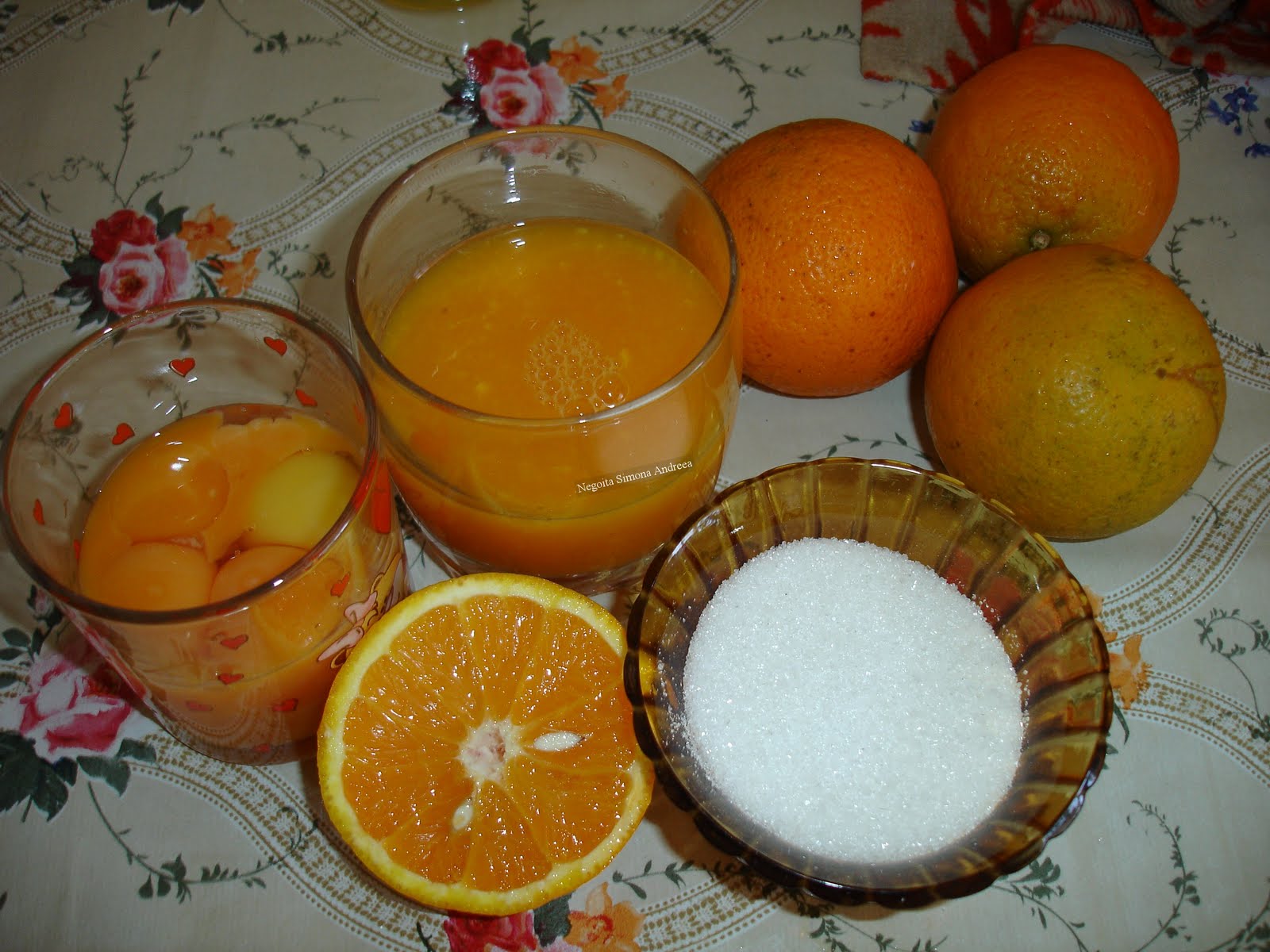 Punem pe baie de aburi galbenusurile impreuna cu zaharul si amestecam continuu pana se dizolva cristalele. ( apa din baie nu trebuie sa fiarba) Se adauga apoi zeama de portocale, esenta si se amesteca aproximativ 10 minute pana la ingrosare. Crema va fi de consistenta unei budinci sau chiar mai groasa. Se lasa pe masa pana la racire cand se va introduce la frigider.