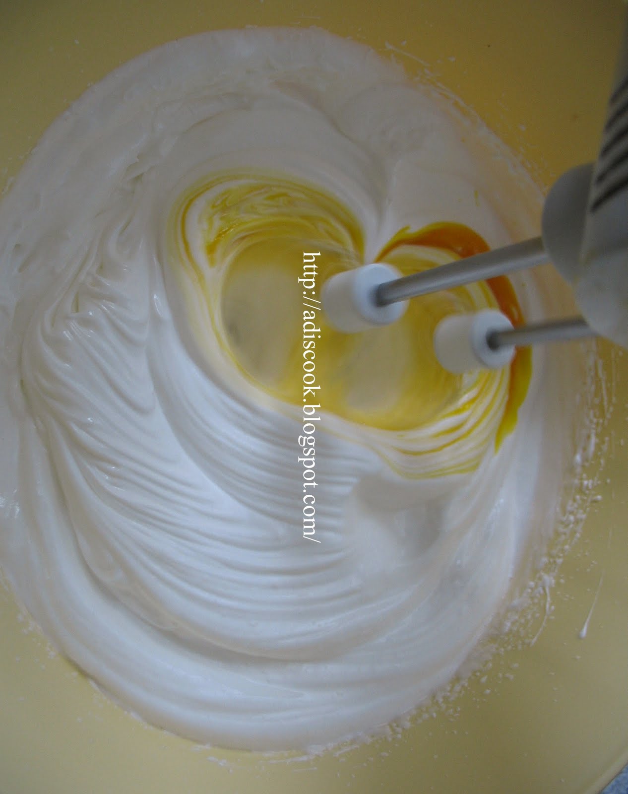 Pentru prepararea blatului am sepat albuşurile de gălbenuşuri; albuşurile se bat spumă, am adaugat treptat zahărul, se bat în continuare până ce spuma se întăreşte. Am pus pe rând gălbenuşurile apoi am încorporat nucile măcinate amestecate cu făina.