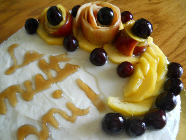 Am decojit doua piersici si un mar, iar cojile le-am strans sub forma de floare. Feliile de piersici le-am pus pe langa "flori". Am completat aranjamentul cu cirese-le-am lasat cu tot cu samburi.