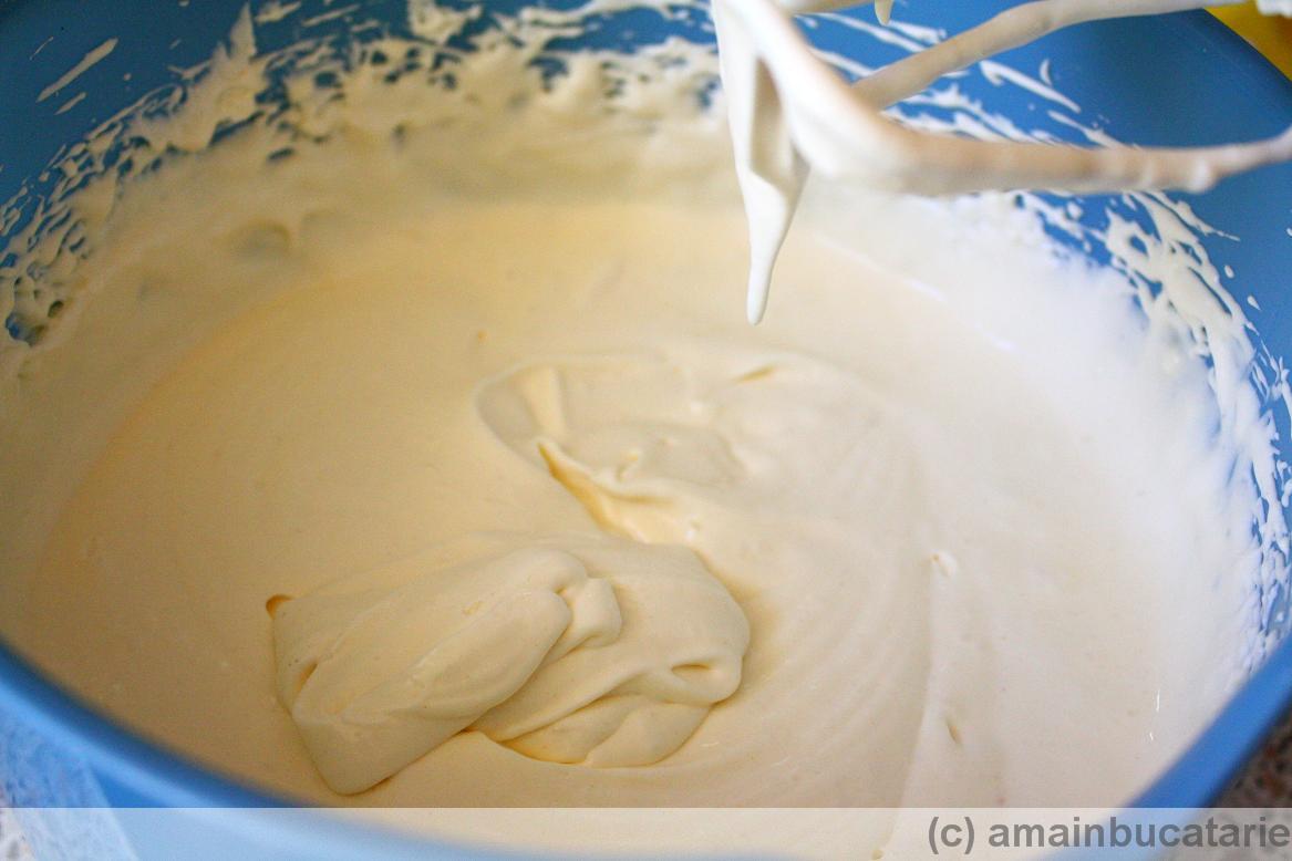 2. Amesteca bine cu mixerul mascarpone cu zaharul, esenta de vanilie, ouale si faina.
