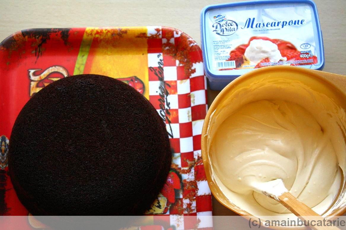 Pregatiti crema: amestecati mascarpone cu zaharul si cafeaua. Amestecati energic si nu va descurajati daca crema pare mai moale, ea va sta foarte bine pe tort.