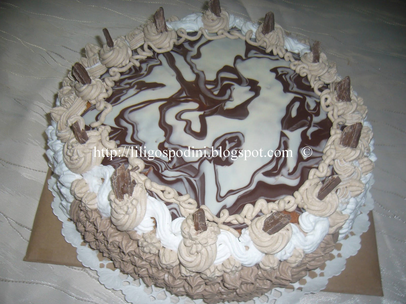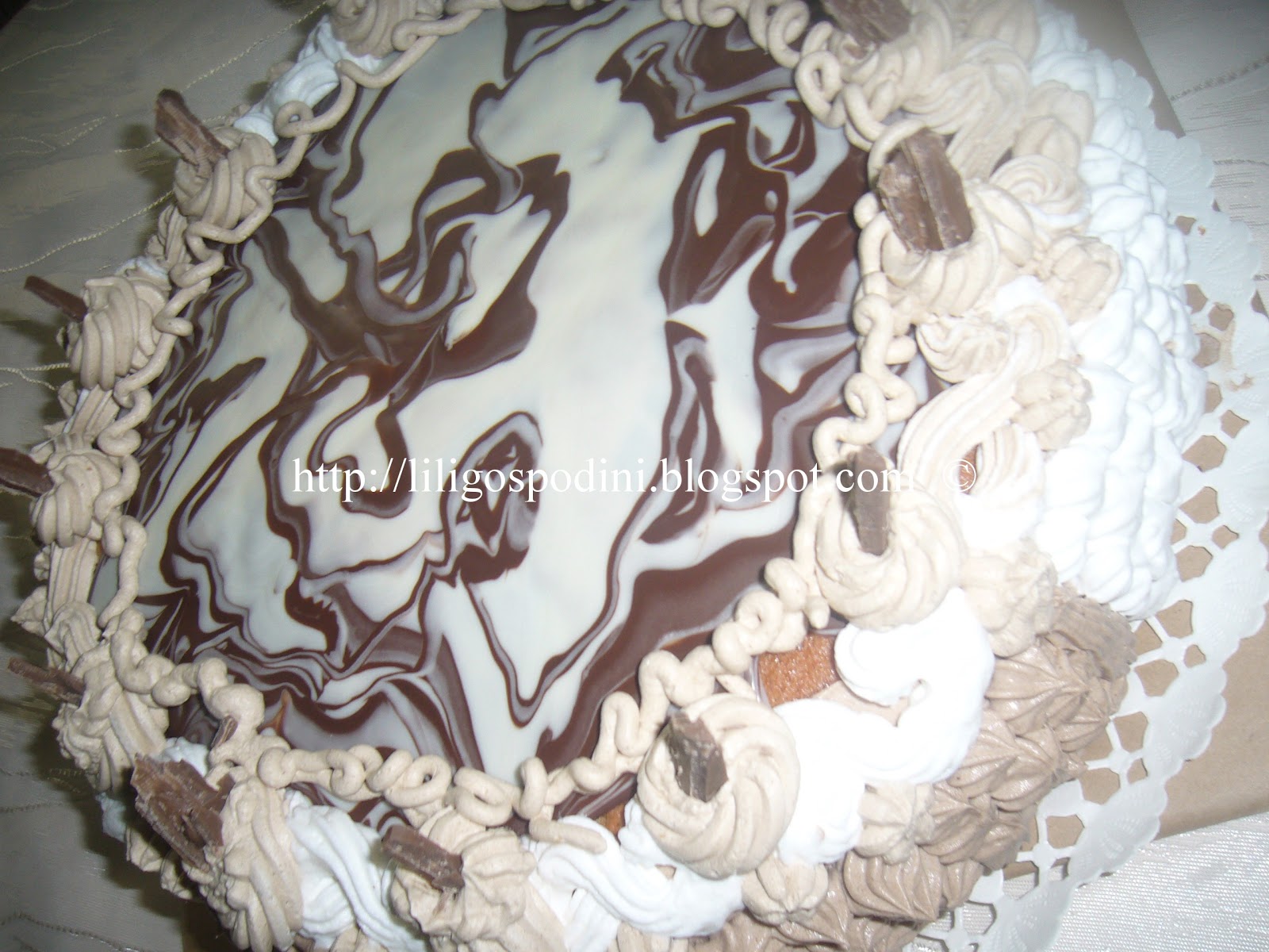 Blat galben, crema ganache si crema caramel, ornat cu frisca si glazura de ciocolata.