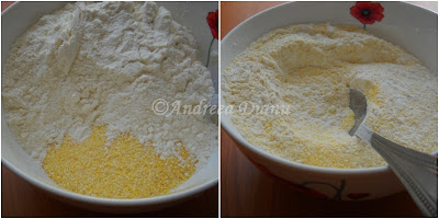 Faina de grau se amesteca cu faina de malai si praful de copt.
