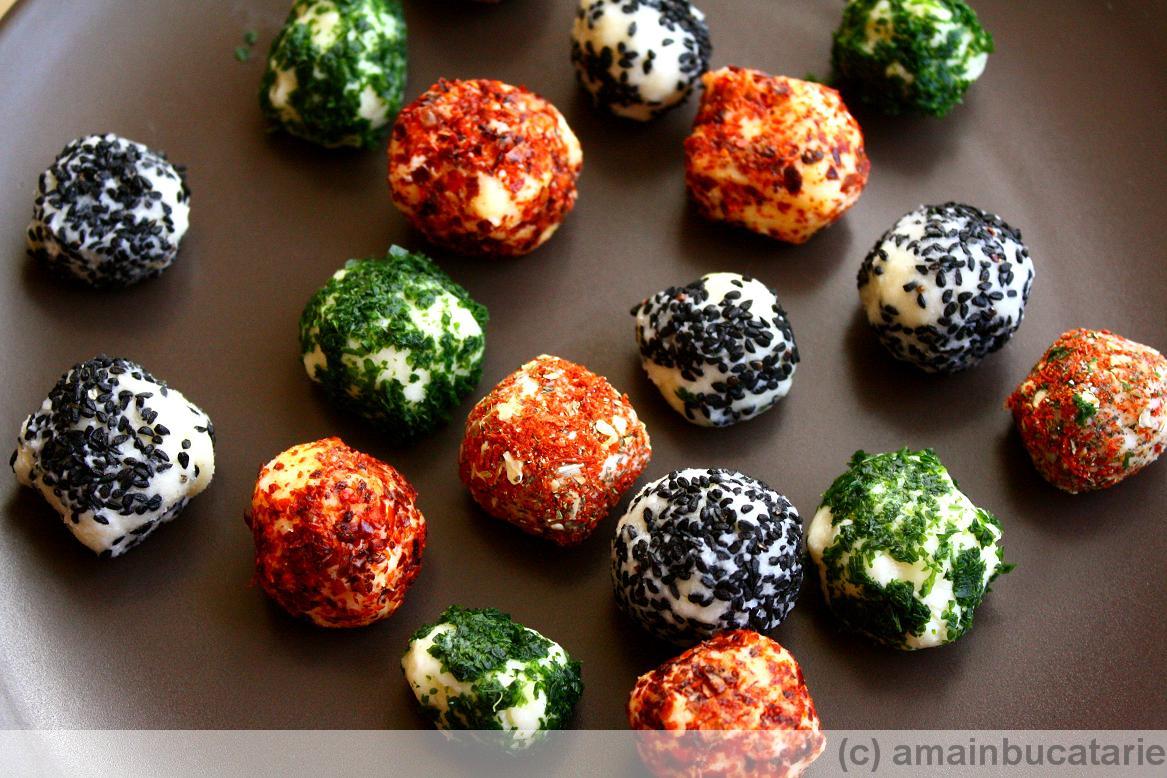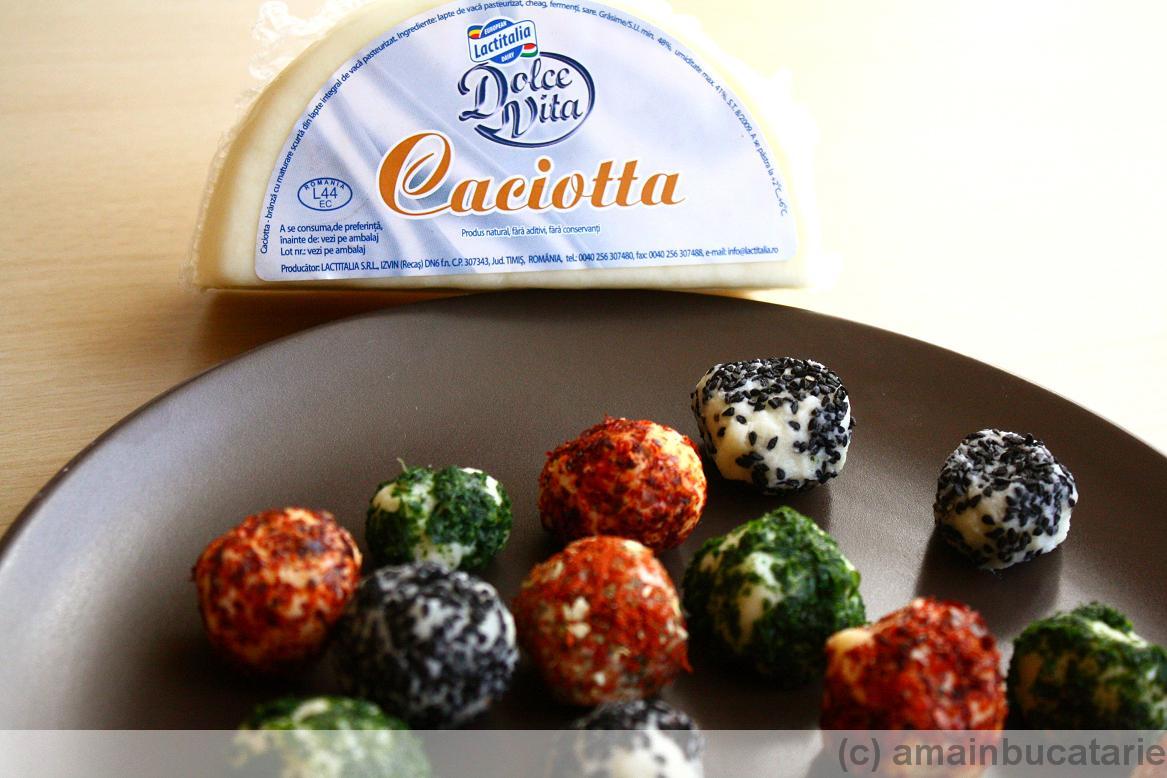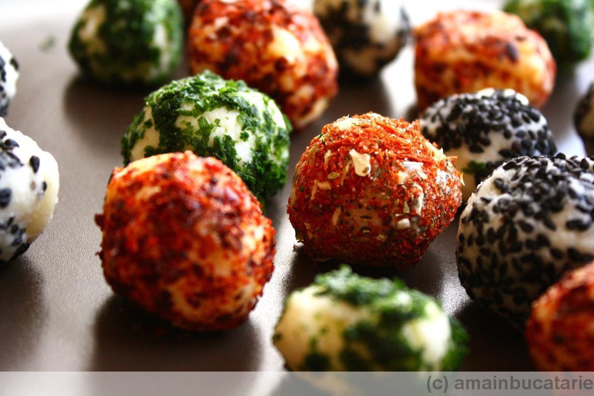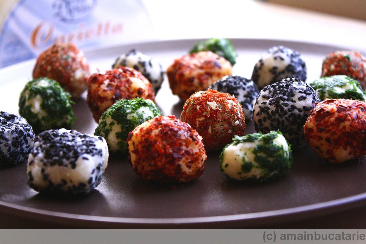 Intre timp pregatiti in farfurioare condimentele pe care doriti sa le folositi. Scoateti bilutele si rulati-le prin condimente.