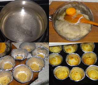 Pentru choux-uri am folosit 100 ml apa, 50 ml ulei, un praf de sare - acestea se pun la fiert. Cand amestecul da in clocot se adauga treptat 3 linguri de faina, se amesteca putin pe foc apoi se da vasul deoparte si se continua amestecatul ingloband 3 oua, pe rand. Aluatul final trebuie sa fie ca o pasta groasa. Am pus aluat cu poşul pe fundul formelor de briosa foarte putin unse cu ulei, apoi am dat la cuptorul preincalzit timp de 15 minute la 180 de grade.
