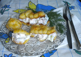Dupa aceea se taie in doua jumatati pe lungime, sau, daca nu au iesit prea bombate, se pun doua cate doua, intre ele fiind orice aperitiv de tip salata sau alt amestec doriti.