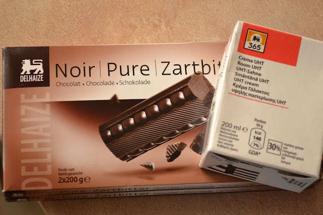 Pentru inceput incalzim 250 ml se smantana dulce impreuna cu cacaoa, amestecand bine cu telul. Cand incepe sa fiarba dam focul mai mic si mai lasam 30 de secunde pe foc, amestecand permanent sa nu se lipeasca. Luam vazul de pe foc si adaugam ciocolata taiata bucati mari, amestecand pana aceasta se topeste, apoi adaugam si restul de smantana dulce si omogenizam bine. Turnam compozitia rezultata intr-un castron si lasam deoparte sa se raceasca.